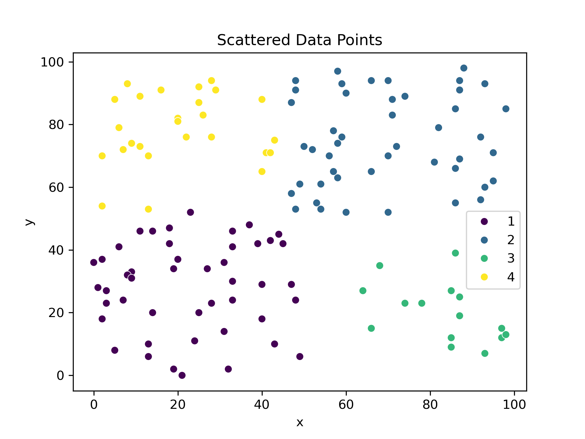 K-means algorithm groups datasets into clusters, where k is the number of clusters. Below are some data points clustered into 4 groups.